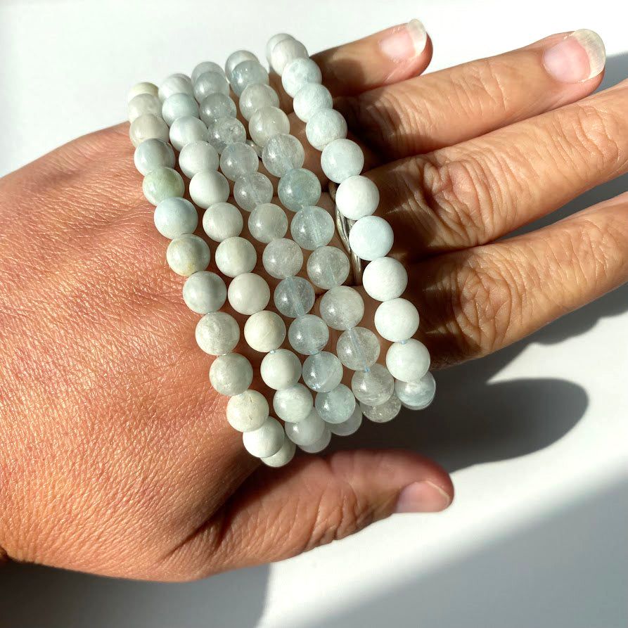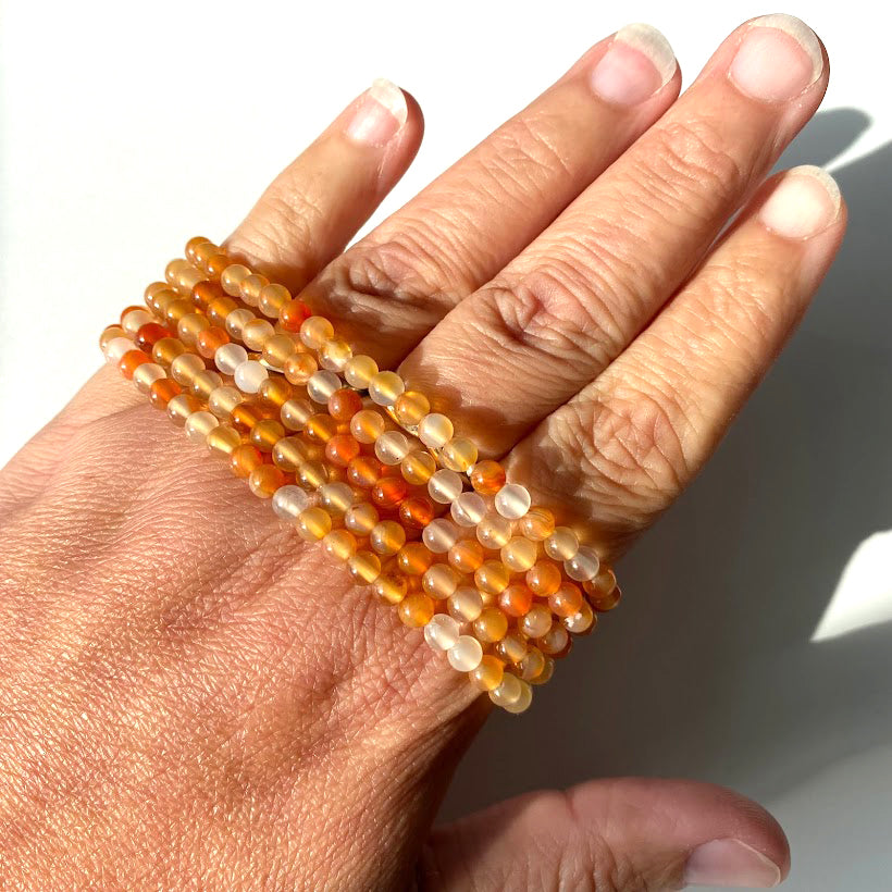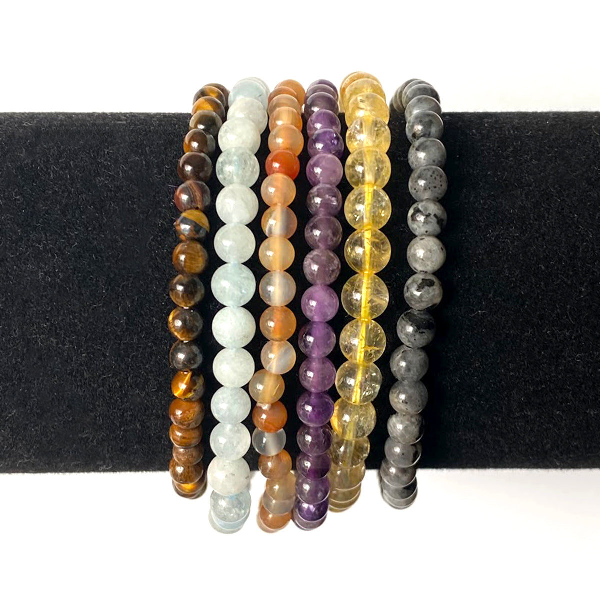 these beaded bracelets are perfect for stacking with their dainty bead sizes. they are available in 4mm amethyst, 4mm tiger eye, 4mm labradorite, 4mm carnelian, 4-6mm aquamarine & 6mm citrine while supplies last.